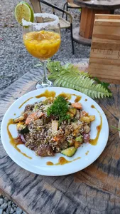 Delicioso ceviche de chicharrón con cocción al barril, acompañado con una salsa acevichada de preparación especial de la casa y canastas de plátano.